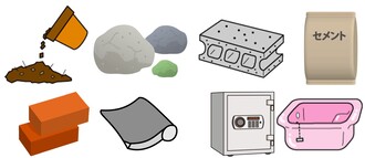 - 土、砂、石、コンクリート、セメント、レンガ、瓦、タイル 等