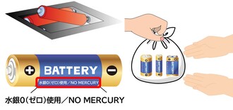 水銀0(ゼロ)使用の乾電池は、家庭からのものに限り持込みできますが、製品から取外し、他の物とは分けていただき、荷下ろしの際は、係員に手渡してください。