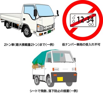 - 積みおろしは、搬入者に行っていただきます。その際、係員はお手伝いできませんので、安全に配慮し、できるだけ2人以上での持込みをお願いします。ただし、持込みする車両以外は、施設内には入れませんので、複数人で荷おろしする際は、持込みする車両に同乗してください。