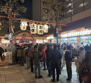 This is a festival honoring Ebessan, the deity of prosperous business. After worshipping at the main shrine, visitors offer a hatsuhoryo (first harvest offering) within the shrine grounds. They receive a fukuzasa (lucky bamboo branch), which is then decorated with charms symbolizing wishes for business success and household safety. The grounds also bustle with people receiving kumade (decorative rakes), auspicious items said to “rake in” good fortune and luck.