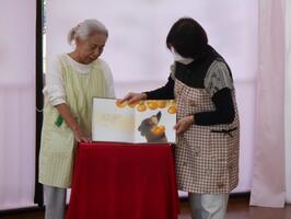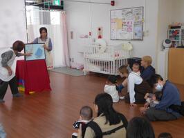 読書の秋を迎え、たくさんの絵本を楽しみました。大型絵本や音楽絵本…優しいタッチで描かれた手作り紙芝居には、赤ちゃんも興味深く見ていましたよ♪