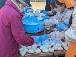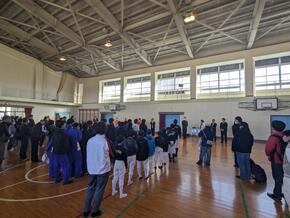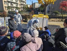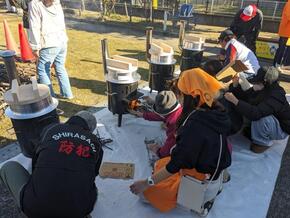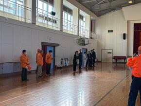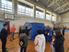 段ボールベッドやパーテーション、応急担架の組⽴や説明、煙体験等が⾏われました。