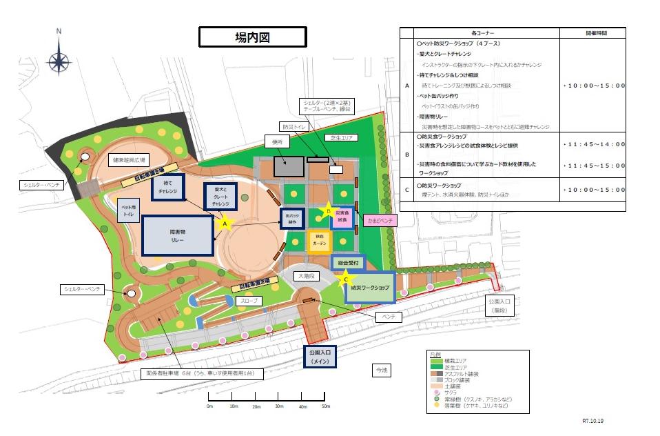 10:00 | イベント開始 | 〇ペット防災ワークショップ(計4ブース) 〇防災ワークショップ (煙テント、水消火器体験、防災トイレ等) ※15:00まで実施 |