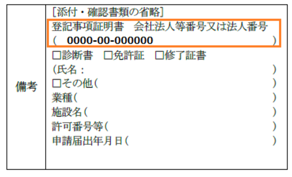 - 申請書等の備考欄に「会社法人等番号」または「法人番号」を記載すること。