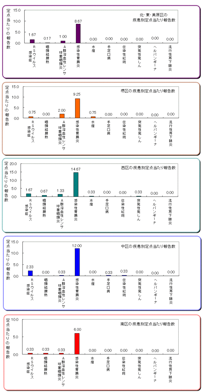 感染性胃腸炎(警報レベル開始基準値:20、注意報レベル基準値なし)は前週比5%減の187例で、西区14.67、中区12.00、堺区9.25であった。