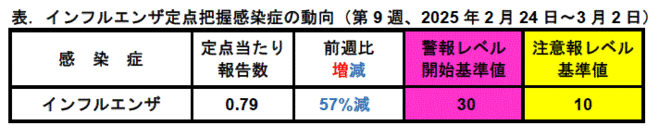 2025年第9週の小児科定点・眼科定点の総報告数は、前週比12.2%減の244例の報告があった。