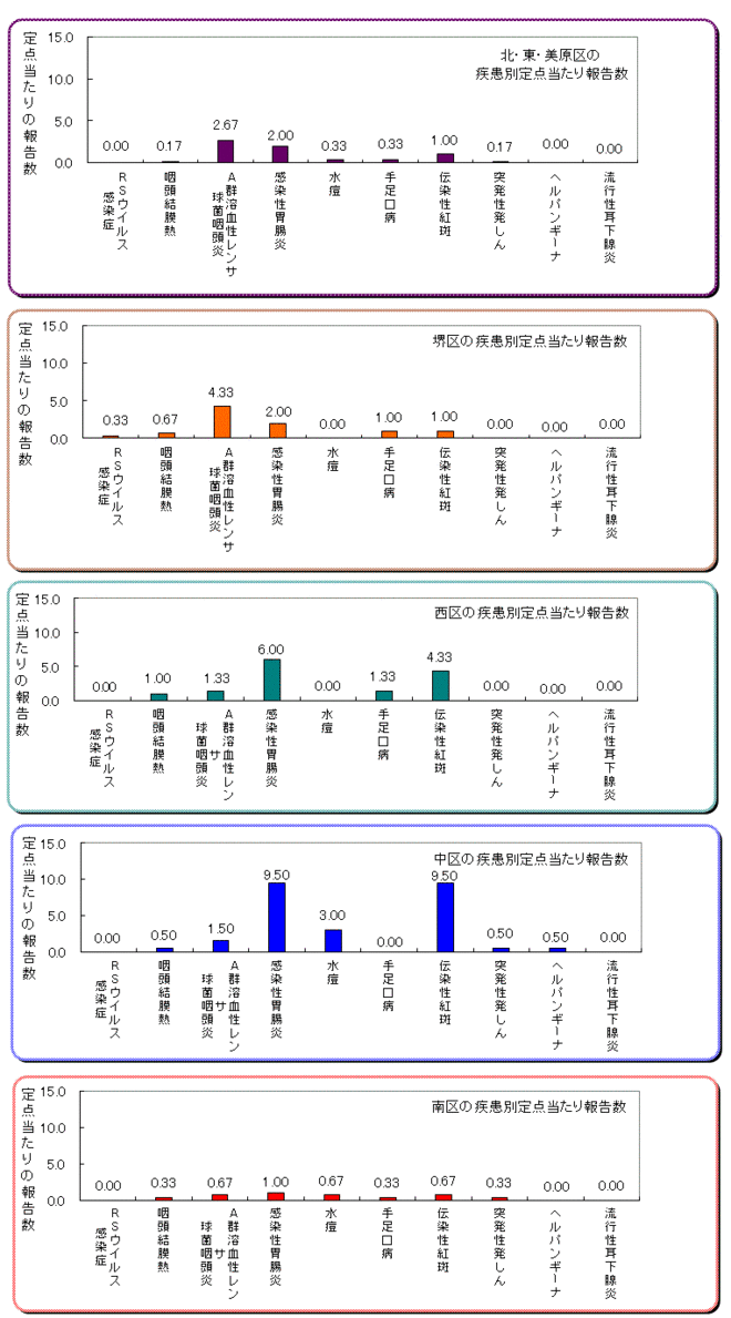 感染性胃腸炎(警報レベル開始基準値:20、注意報レベル基準値なし)は前週比17%減の58例で、中区9.50、西区6.00、北区・東区・美原区/堺区2.00であった。