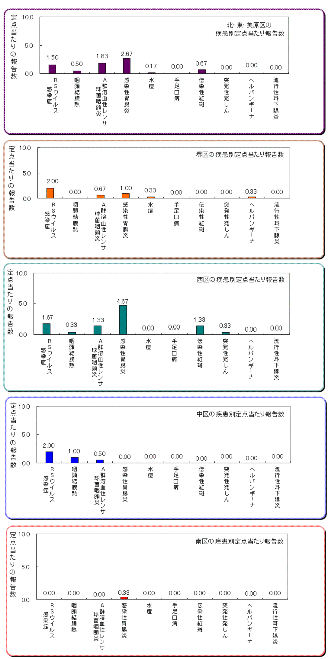 RSウイルス感染症(警報レベル開始基準値なし、注意報レベル基準値なし)は前週比35%減の24例で、堺区/中区2.00、西区1.67である。