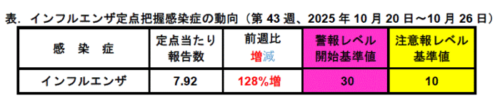 2025年第43週の小児科定点・眼科定点の総報告数は、前週比17.8%減の83例の報告があった。