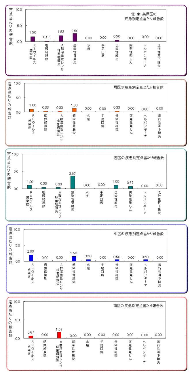 インフルエンザ(警報レベル開始基準値:30、注意報レベル基準値:10)は前週比53%増の537例で、定点あたり報告数は21.48である。北区26.13、堺区20.75、中区20.67であった。