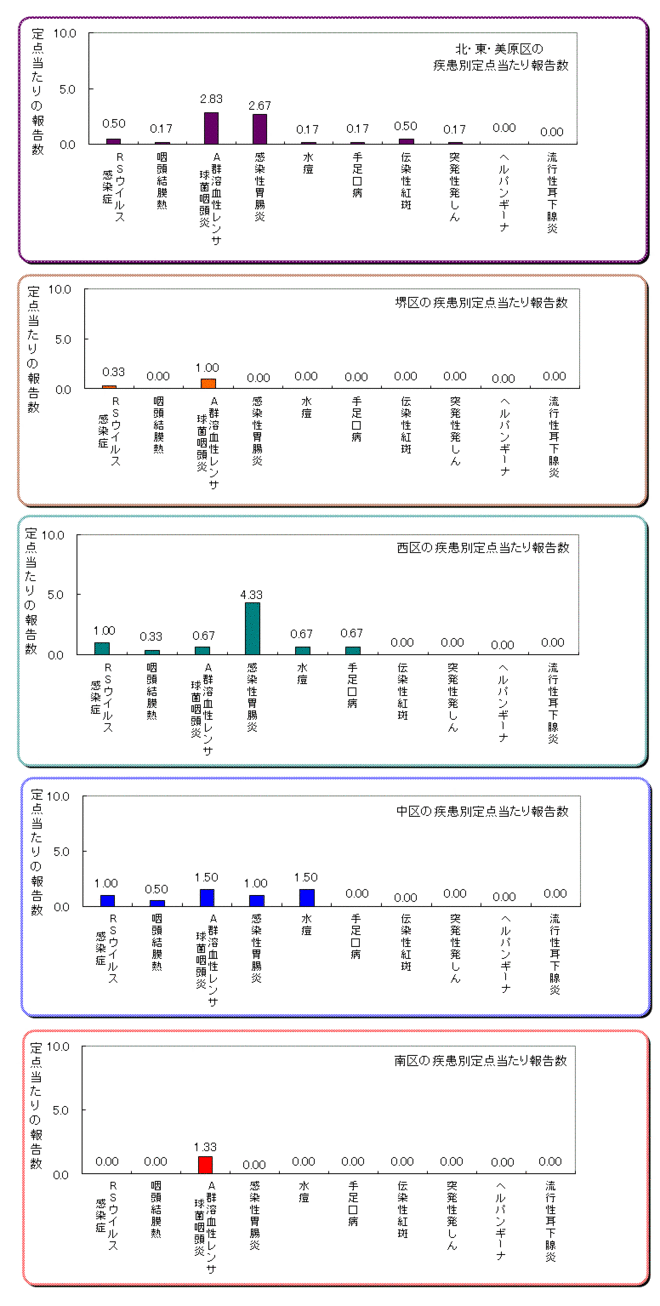 感染性胃腸炎(警報レベル開始基準値:20、注意報レベル基準値なし)は前週比7%増の31例で、西区4.33、北区・東区・美原区2.67、中区1.00であった。
