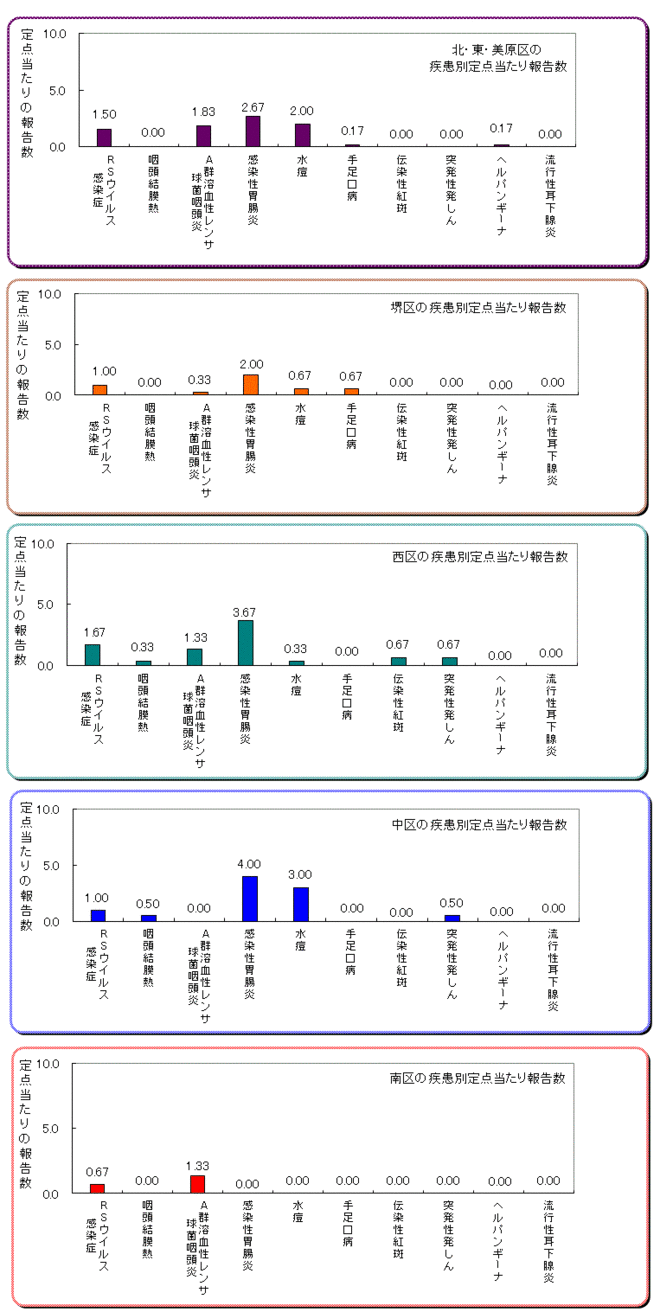 RSウイルス感染症(警報レベル開始基準値なし、注意報レベル基準値なし)は前週比425%増の21例で、西区1.67、北区・東区・美原区1.50、堺区/中区1.00である。
