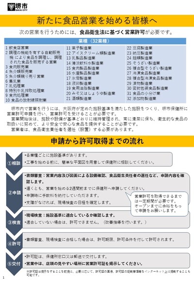 堺市内で新たにカフェや居酒屋などの飲食店を開業する、または食品を製造、加工、販売する際には食品衛生法に基づく許可が必要です。必要書類をご準備のうえ、オープンの2~3週間前を目途に申請をお願いします。
