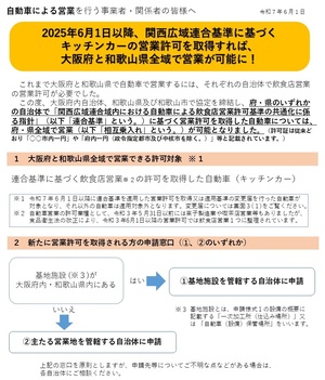 関⻄広域連合では、「ビジネスしやすい関⻄」に向け、⾃動⾞による飲⾷店営業の許可基準を共通化するため、「関⻄広域連合域内における⾃動⾞による飲⾷店営業許可基準の共通化に係る指針」を策定しました。