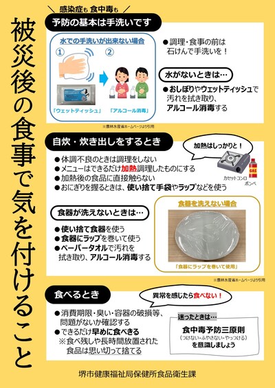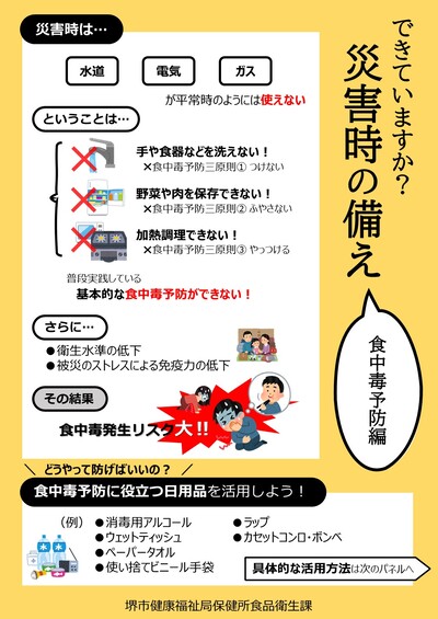 しかし、ライフラインの断絶により水道、電気、ガスが平時のように使えないことで衛生水準が低下し、被災時の食事においては食中毒予防の3原則(菌をつけない、ふやさない、やっつける)に基づく基本的な食中毒予防が難しくなります。さらに、被災のストレスによる免疫力の低下で食中毒発生の危険性が高まることが懸念されます。