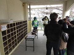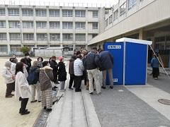 指定避難所である新浅香山小学校に地域の方が集まり、3班に分かれてマンホールトイレの確認、災害時優先電話やガス発電機の使用訓練、段ボールベッドやワンタッチパーテーション組み立て訓練が行われました。