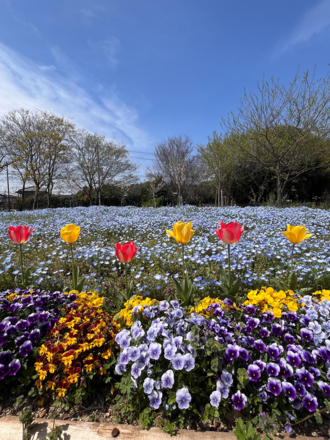 一面に広がるネモフィラのじゅうたん。色鮮やかなチューリップがアクセントに🎵青空をバックに心地よい風が吹き抜ける感じがテンションを上げてくれます。