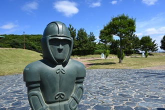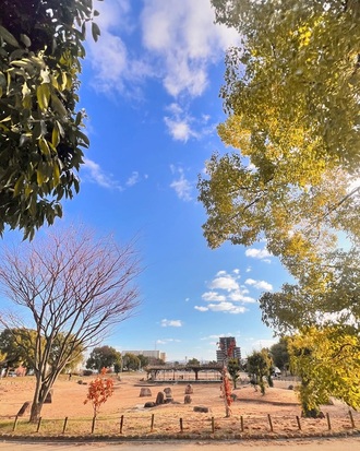 ニサンザイ古墳に隣接する御陵山公園。公園の周りに見守るように配置されている埴輪は実は車止めなんです。公園内には馬型埴輪のベンチなど古墳にちなんだものがあり、古代ロマンを楽しめます。
