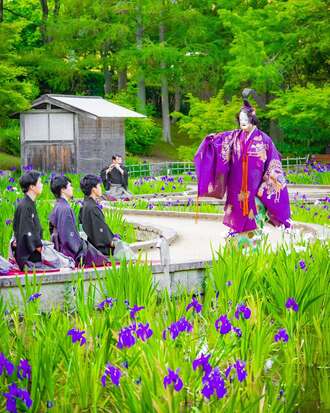 大泉緑地かきつばた園で、毎年開催される「能楽」。伊勢物語と能の世界。満開のカキツバタの中で厳かに舞う様子はまるで絵巻の中のワンシーンのようです。自然の中で気軽に能が楽しめる素敵なイベント🎵
