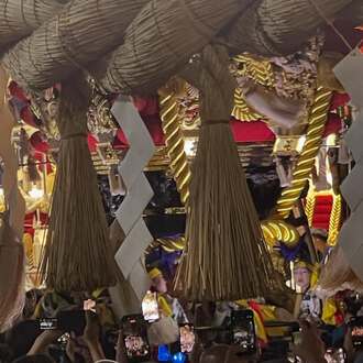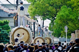 普段の穏やかな百舌鳥八幡宮とは打って変わって大観衆に埋め尽くされる境内。仲秋の名月に合わせて行われる月見祭では、勇壮なふとん太鼓を一目見ようと多くの方が訪れます。しめ縄越しのレアショット📷