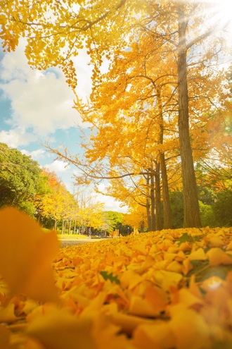 まぶしいほどの黄色のイチョウのじゅうたん。見上げた木々も見事に黄色に染まり、はらはらと散る様子も空に両手を広げて秋を満喫したくなります。