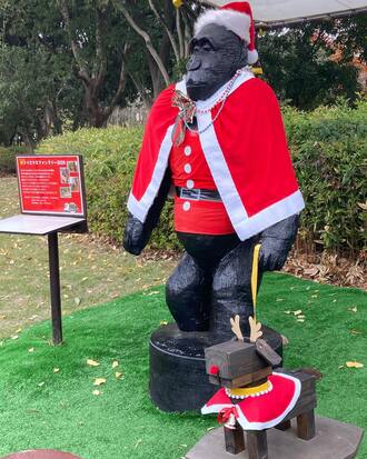 大泉緑地のアイドル「ゴリちゃん」サンタがトナカイサンタと登場してクリスマスムードを盛り上げます。赤と黒のコントラストがお似合いのゴリちゃんと一緒に写真撮影も☺