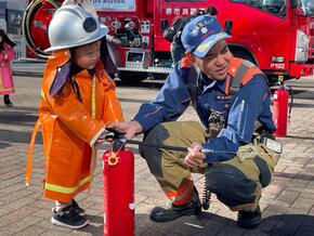 こども消防服を借りて、水消火器体験や消防車との記念撮影ができます。クリスマスマーケットも実施します☆