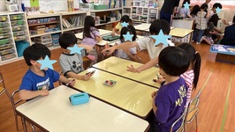 今回は、ぞう組は紙コップを使ったクレーンゲームを、くま組は紙コップとビニール袋を使って吹き出しお化けを作りました。