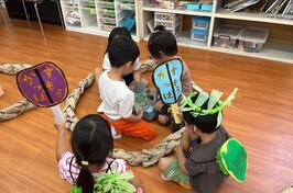 暑さ指数が高く戸外での遊びができないので、屋内のいろいろな場所を使って遊んでいます。