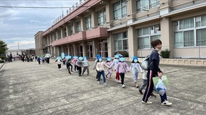 いつもなら園庭に避難しているのですが、「今からさつきの小学校まで避難します」とこどもたちに伝えると、少し緊張気味に訓練を続けていました。