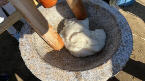 蒸したてのおこわを見たり触ったりして「いい匂い~」と歓声をあげ、職員がおこわを石の臼と杵でつぶしていく様子を見て、わくわくしていたこどもたちでした。