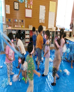4歳児は友達と気持ちを合わせてパラバルーンをしました。ポンポンが空高く舞い上がりました。