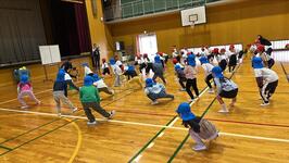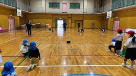授業のテーマは『美原ひがしこども園の友だちと楽しく体育をしよう!」で、準備運動から始まりさまざまな運動あそびを一緒に取り組みました。はじめは『動物リレー』でいろいろな動物になってリレーをしました。次はマット運動でした。マットの上を転がったり手をついて足を蹴り上げるなどの難しい動きも1年生と一緒にチャレンジしていました。最後は的あてゲームをしました。ボールを投げて的を落とします。的からの距離を選べて好きな位置から投げることができました。一番遠くから投げる友だちもいれば1回投げてあたらなかったので2回目は近くから投げる友だちもいました。学校の先生からもたくさん応援してもらい嬉しそうでした。