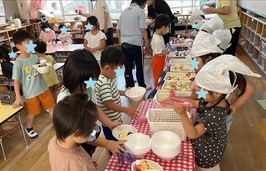 3歳児きりん組のこども達は、うどん屋さんです。みんなが大好きな「うどん」「おにぎり」「ジュース」、トッピングに「エビの天ぷら」「お芋の天ぷら」などを作りました。