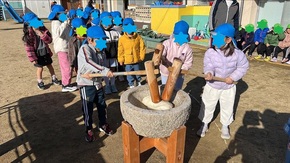 3・4・5歳児のこどもたちは、お餅をつく経験もしました。こども用の細い杵で、みんなからの「よいしょ~!」の応援をもらいながら笑顔いっぱいにもちつきを楽しんでいました。