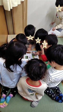 散歩先で見つけた『きのこ』を図鑑で調べています。「これは何」「どうして」といった疑問に自分たちで答えを見つけています。好奇心を育み、知識を増やすだけでなく、学ぶ喜びを知るきっかけにもなっています。