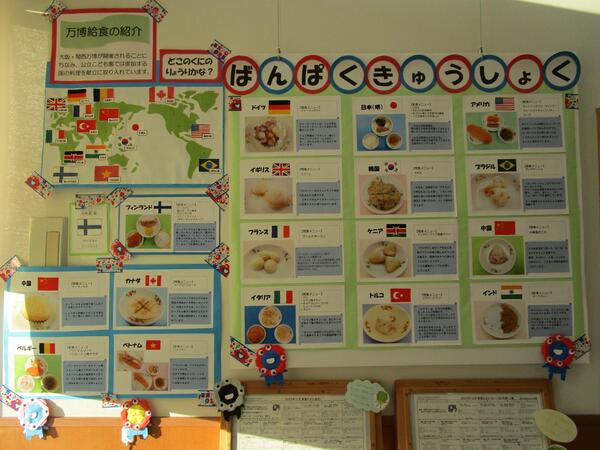令和7年に大阪・関西万博が開催されることにちなみ、令和6年6月から、公立こども園では参加する国の料理を献立に取り入れた「万博給食」を実施しています。