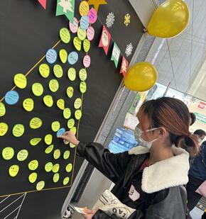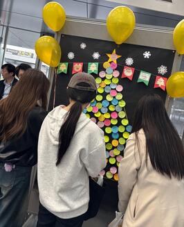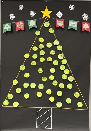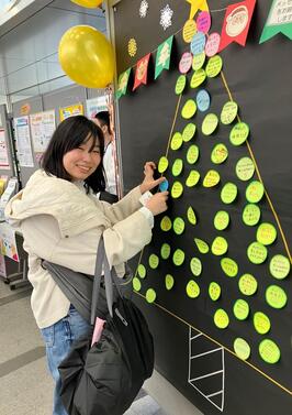- フードドライブでご寄附いただいた方からいただいた応援メッセージ(葉っぱ)を受けて、参加者のみなさんからも感謝の気持ちやこれからの意気込みなどのメッセージ(オーナメント)を書いてもらいました!