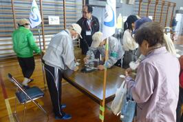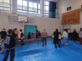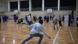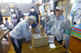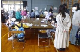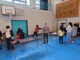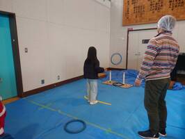 令和7年12月14日(日曜)、東三国丘小学校体育館でこどもを対象に輪投げを行いました。本来校庭で行う予定でしたが、天候が少し悪かったので、体育館の隅を借りて行いました。当日は校区の餅つき大会で、体育館はつきたての餅の試食会場になっていて、共同行事として行いました。沢山の親子が参加してくれました。