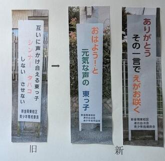 令和7年9月17日(水曜)~20日(日曜)に、立看板の取替えを行いました。20年以上前から校区内5か所に設置していますが、古くなり、枠などがぼろぼろになっていたため、連合自治会と連携して取り替えました。