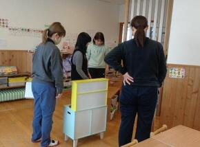 保育室の保育環境の工夫について、実際に机などを移動しながら具体的に配置の仕方をアドバイスしていただいたり、玩具の入れ替えの方法、コーナーの作り方などを教えていただきました。