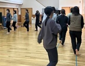 さくら・さくらんぼリズム運動について、先生たちが体を動かしながら、ピアノの音に合わせてどのように体を動かすのか、また、その際に意識するポイントなどを教えていただきました。実際に体験する中でこどもへの声掛けの仕方や支援の方法などが分かり、保育の中で行う時のイメージをもつことができました。また、保育者主導ではなく、こどもが自分で動きたい気持ちを引き出す環境づくりが大切だと職員間で共有する事ができました。