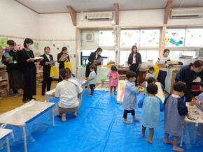 第75回造形表現・図画工作・美術教育研究全国大会大阪大会が行われ、公開保育を行いました。3歳児は「こなしお絵の具で遊ぼう!」、4歳児は「土粘土で遊ぼう!」、5歳児は「自然物と粘土を使って遊ぼう」と、こどもたちが自分なりの表現を楽しみながら伸び伸びと遊ぶ様子が見られました。全体会では、各担任からこれまでの保育の経過やこどもの姿の見取りを踏まえ、本時の保育の中でどのようなことをねらい、環境構成や援助を行ったのかなどについて話がありました。その後、グループ討議では、こどもたちの主体的な姿や、主体性を引き出すための先生の関わりや環境構成など、それぞれ感じたことを出し合い、活発な意見交換となりました。最後に、大阪大谷大学 山本将之准教授から本日のこどもの姿や、保育に取り組む教師について様々な観点から指導助言や講話がありました。