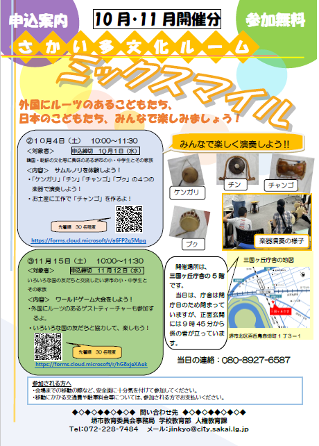 さかい多文化ルーム「ミックスマイル」では、堺市立小・中学校に通う外国にルーツのあるこどもたちと、日本のこどもたちが様々な活動を通して交流をします。
