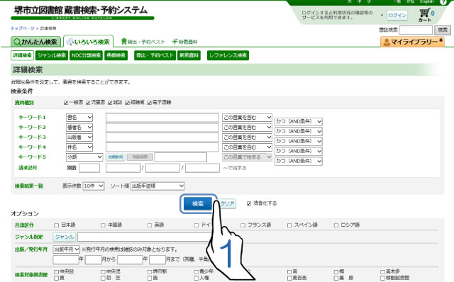 - 蔵書検索・予約システムで資料を検索します。