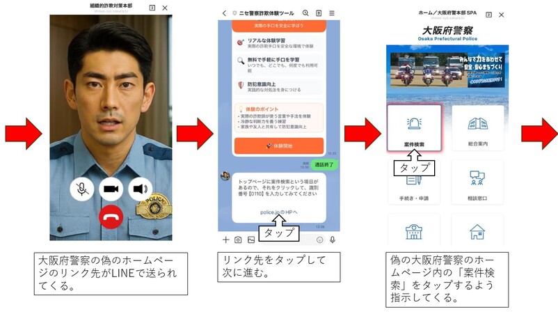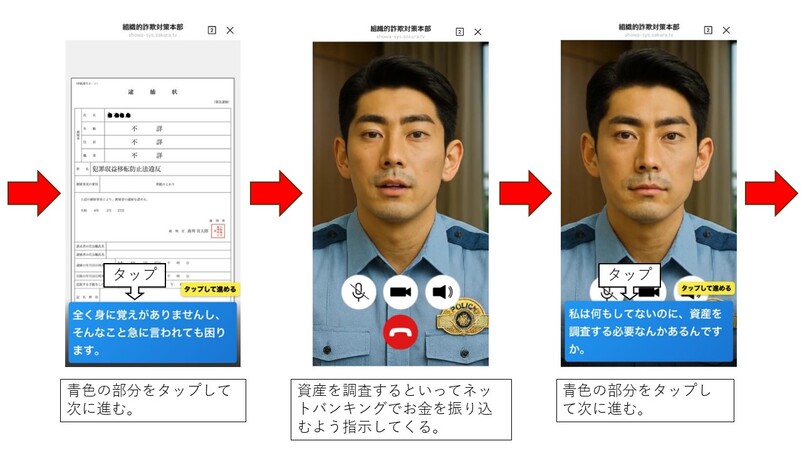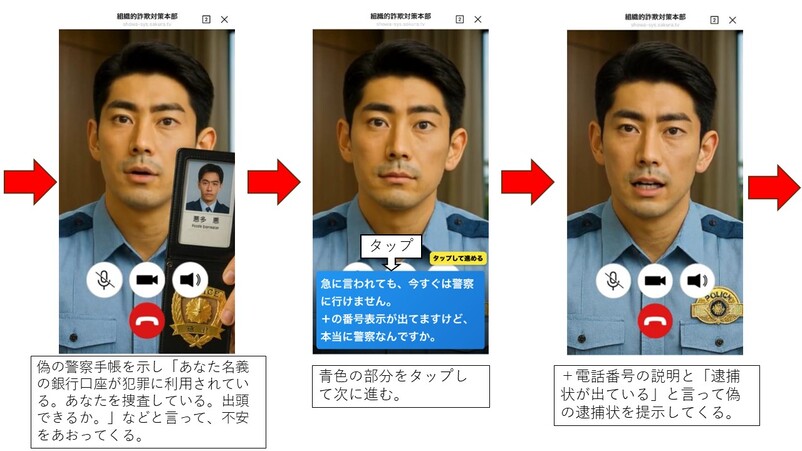 ビデオ通話で偽物の制服を着た警察官の姿を見せつけて本物の警察官と信じ込ませたり、偽物の警察手帳を見せてきたりします。