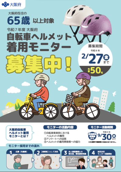 大阪府では65歳以上の方を対象に自転車ヘルメット着用モニターを募集しています。