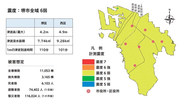 南海トラフ地震では、堺市全域で震度6弱の揺れが想定されています。