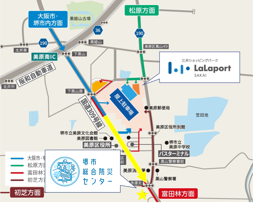 ららぽーと堺から国道309号沿いを富田林方面へ進むと、堺市総合防災センターに到着します。