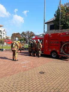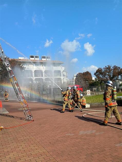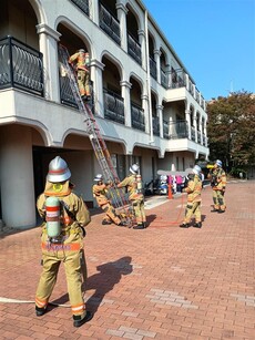 合同訓練では2階部に救助を求めている人がいる想定で行われていました。各消防隊は三連梯子と放水を組み合わせ安全に救助者を救出し、施設の方々も落ち着いた様子で避難できていました。